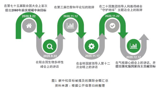 碳中和目标多次被提及,彰显中国应对全球气候变化决心。2020年9月22日,中国国家主席习近平在第七十五届联合国大会上首次提出“中国将提高国家自主贡献力度,采取更加有力的政策和措施,二氧化碳排放力争于2030年前达到峰值,努力争取2060年前实现碳中和”,随后在各大国际会晤中多次提及2060碳中和目标(见图1),彰显中国应对全球气候变化的决心。2020年12月12日,中国国家主席习近平在气候雄心峰会上发表讲话,宣布将提高应对气候变化《巴黎协定》下的国家自主贡献,“到2030年,中国单位国内生产总值二氧化碳排放将比2005年下降65%以上,非化石能源占一次能源消费比重达25%左右,森林蓄积量将比2005年增加60亿立方米,风电、太阳能发电总装机容量将达12亿千瓦以上”。在2020年12月中旬召开的中央经济工作会议中,做好碳达峰、碳中和工作也被列入2021年八项重点任务之一,而加快建设全国碳排放权交易市场也被列为实现该重点任务的主要途径之一。