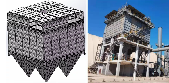 中钢天澄开展节能型袋式除尘器的大型化研究与设计,并成功将其应用于某钢铁厂原料除尘工程上,单模块处理风量可达33万m3/h(如图1)。运行结果表明,颗粒物排放浓度约5mg/m3,设备过滤阻力500Pa~800Pa ,显著降低了设备阻力和运行能耗,减少占地30%,节约钢材10%~15%。