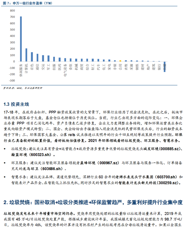 垃圾焚烧:随着垃圾焚烧行业的逐渐成熟,国补退坡取消部分逐渐由地方政府承担顺价是必然趋势。国补的退坡以及取消,对于部分运营能力较弱,环保排放不达标,股东背景薄弱,顺价能力不强的小型垃圾焚烧发电企业有较大冲击,而行业内优质的龙头企业,具有资金+运营能力+政府资源等多项竞争优势,有望抓住国补退坡背景下的行业整合机会,顺势通过并购扩张提升自身的市占率水平。