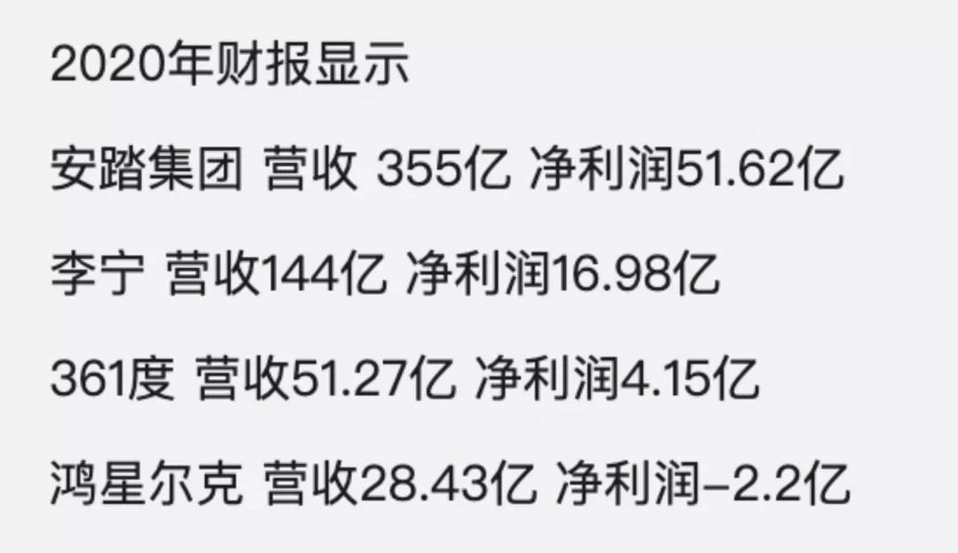 据鸿星尔克2020年财报显示,鸿星尔克营收额为28.43亿元,净利润却为-2.2亿元。与同类企业的营收情况相比,不及李宁的1/5,也不及安踏的1%,确实不容乐观。